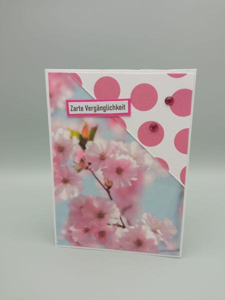 Die Karte ist diagonal zweigeteilt. Ein Bereich zeigt eine sanfte Fotografie von zarten, hellrosa Kirschblüten vor einem verschwommenen, hellblauen Hintergrund. Die Blüten wirken fast transparent und vermitteln einen Eindruck von Vergänglichkeit und flüchtiger Schönheit.