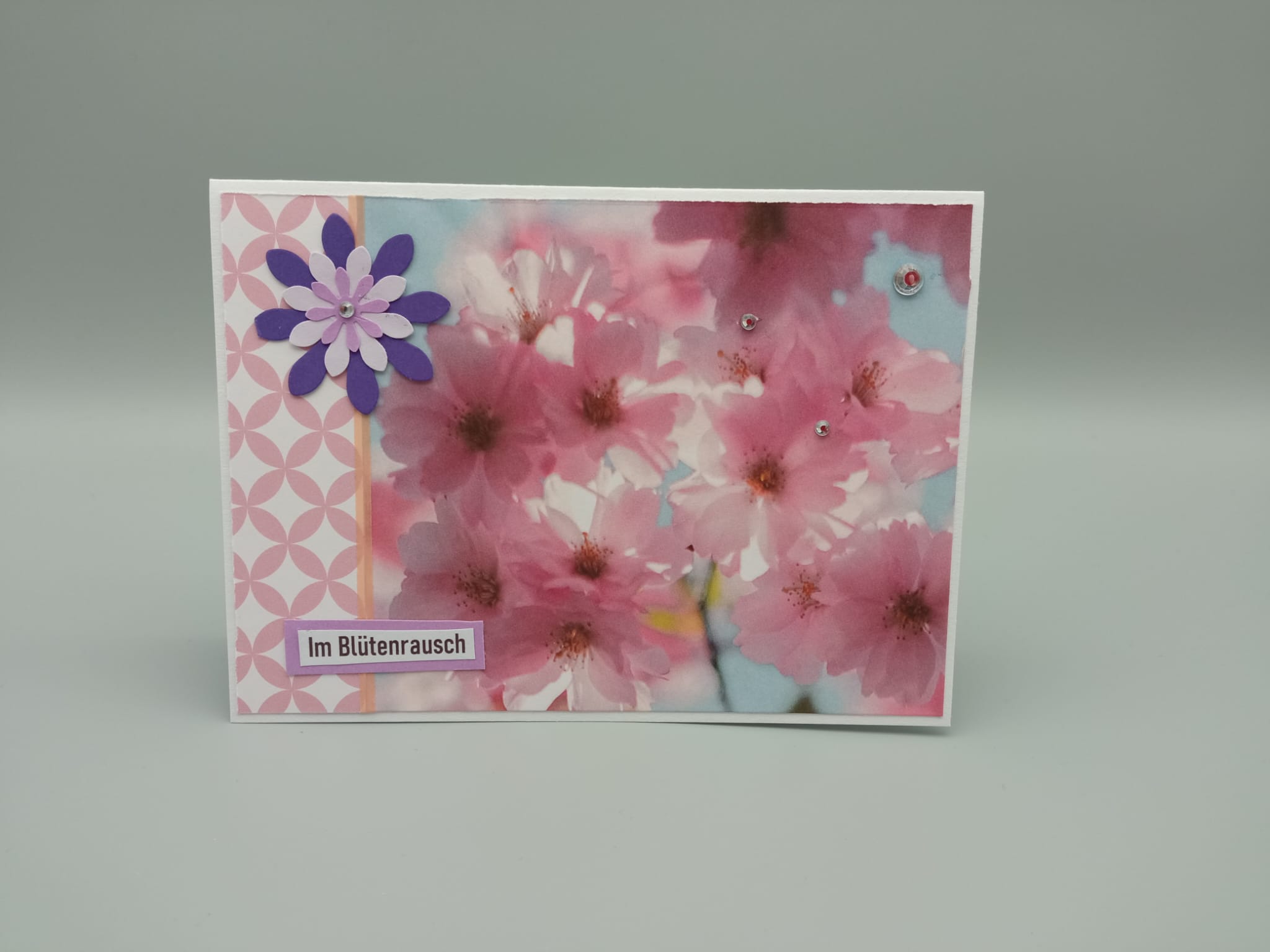 Ein besonderer Blickfang ist eine große, dekorative Blume in verschiedenen Violett- und Lilatönen, die am oberen linken Rand platziert ist. Diese kunstvoll gestaltete Papierblume mit mehreren Blütenblatt-Schichten und einem glitzernden Mittelpunkt zieht die Blicke auf sich und verleiht der Karte eine besondere Note.