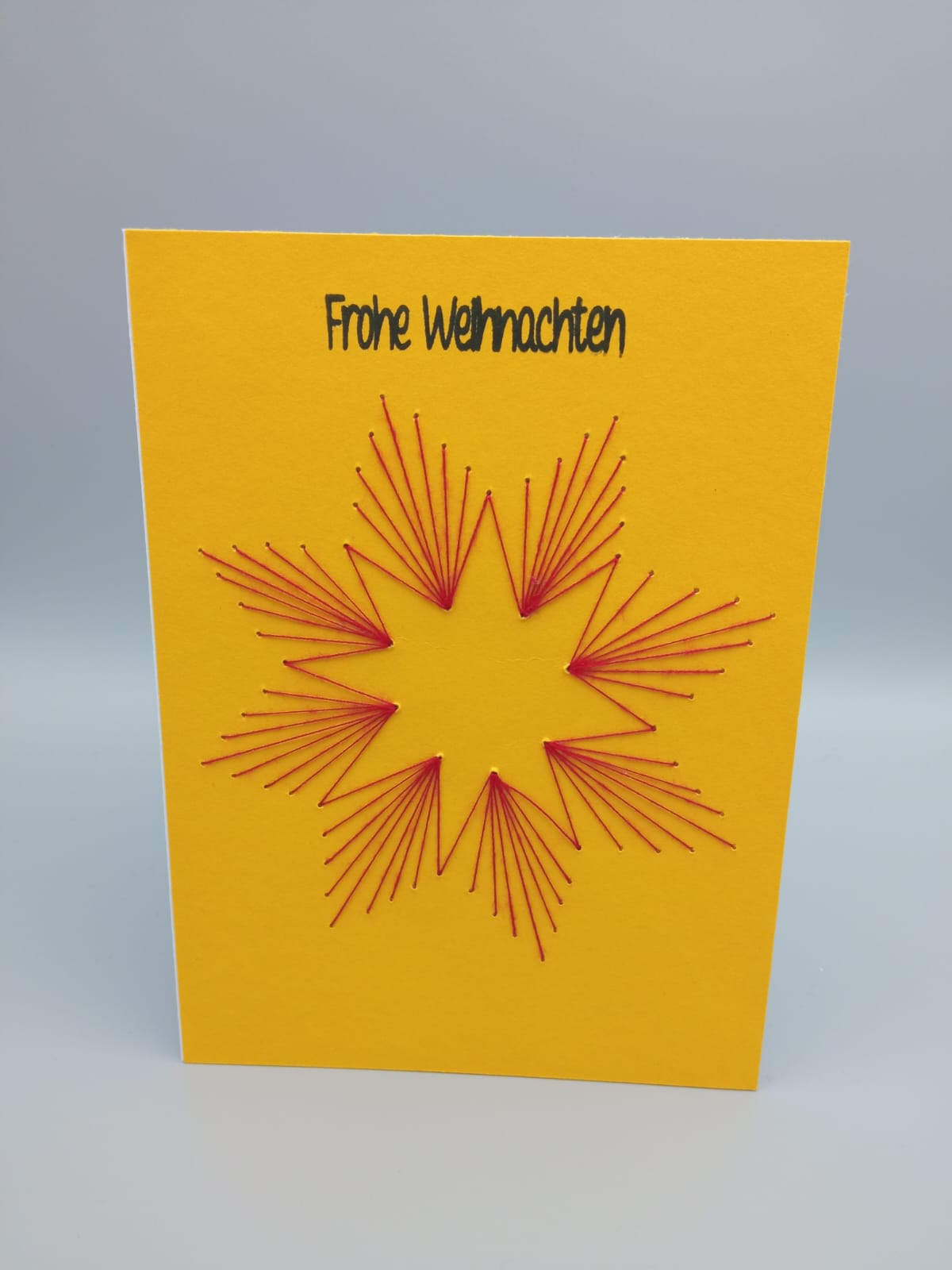Der geometrisch stilisierte Stern wird sorgfältig in Fadenkunst (String Art) mit rotem Faden auf den gelben Karton genäht. Das schlichte, aber deutliche "Frohe Weihnachten" in Schwarz oben sorgt für einen klaren Kontrast.