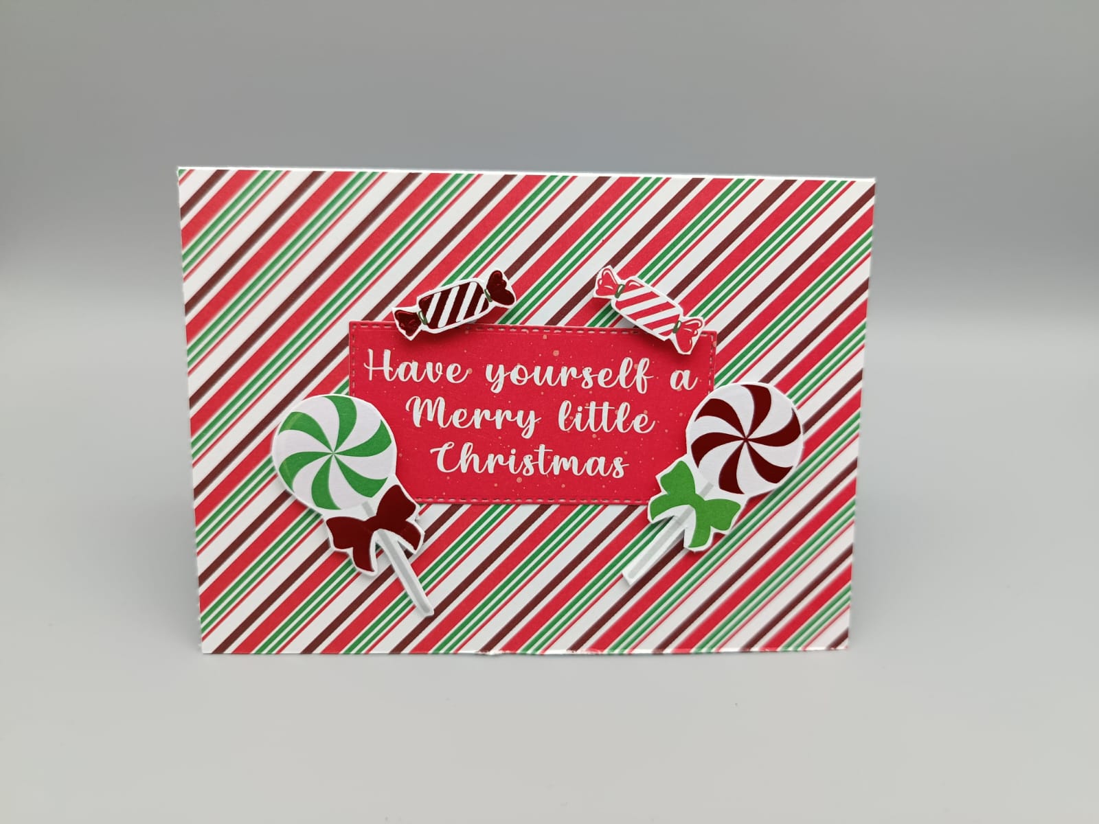 Liebevoll gestaltete Weihnachtskarte mit diagonalem rot-weiß-grün gestreiftem Hintergrund und zentralem, rotem Label mit weißer Schrift: Have yourself a Merry little Christmas. Um das Label herum sind bunte Bonbon- und Pfefferminzgrafiken angeordnet, die einen fröhlichen, verspielten Candy-Look erzeugen. Gedruckt auf hochwertigem, leicht strukturiertem Karton; ideal als Grußkarte, Geschenkbeilage oder saisonale Kundenkarte; wird einzeln mit passendem Umschlag geliefert.
