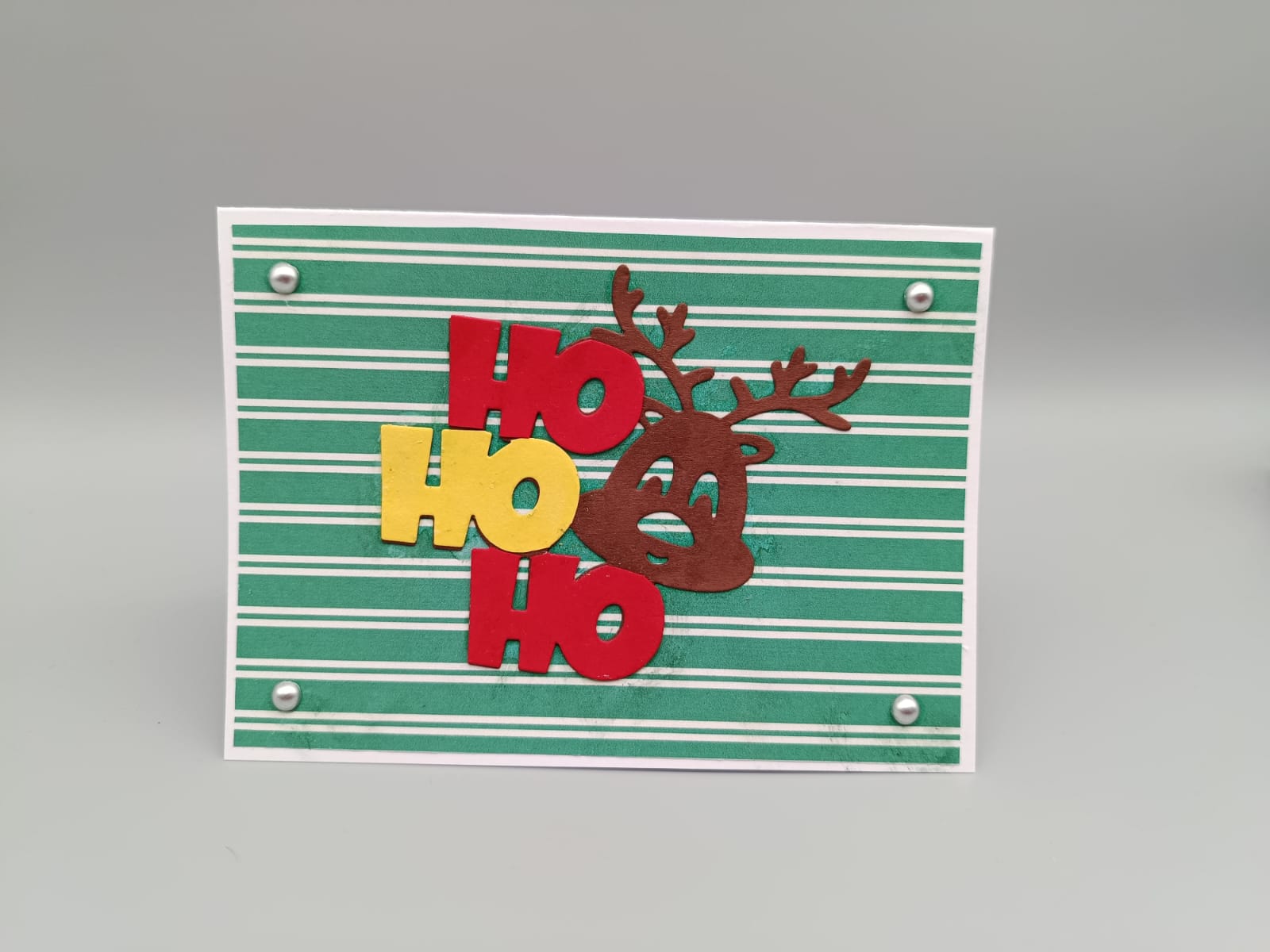 Fröhliche Weihnachtskarte mit modernem, verspieltem Design und klarer Botschaft „HO HO HO“, ideal zum Versenden persönlicher Weihnachtsgrüße.
