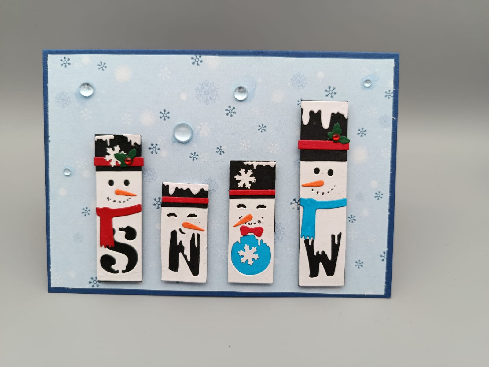 Fröhliche Winter-Grußkarte mit vier liebevoll gestalteten Schneemännern, die zusammen das Wort SNOW bilden und eine verspielte, saisonale Stimmung vermitteln.
